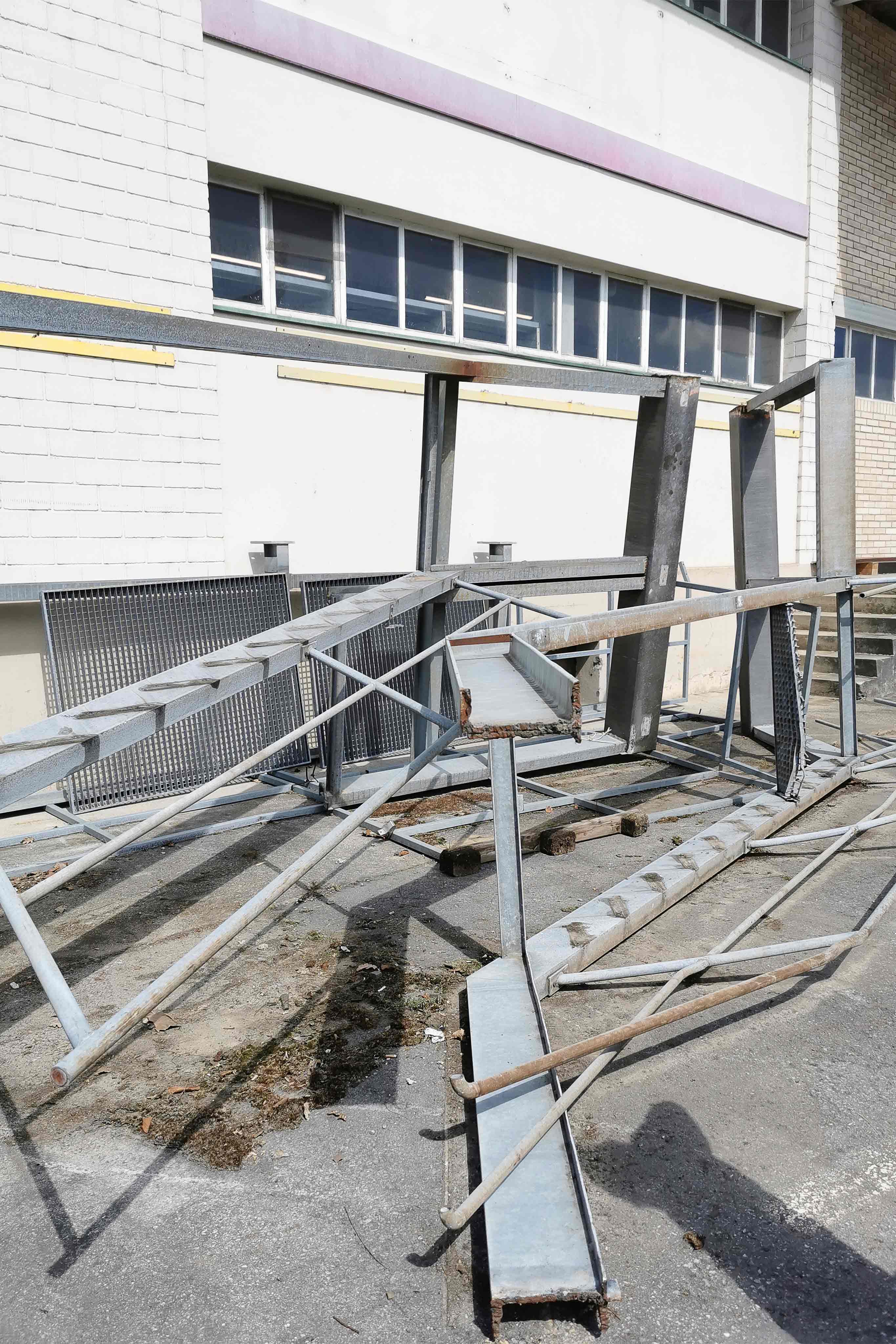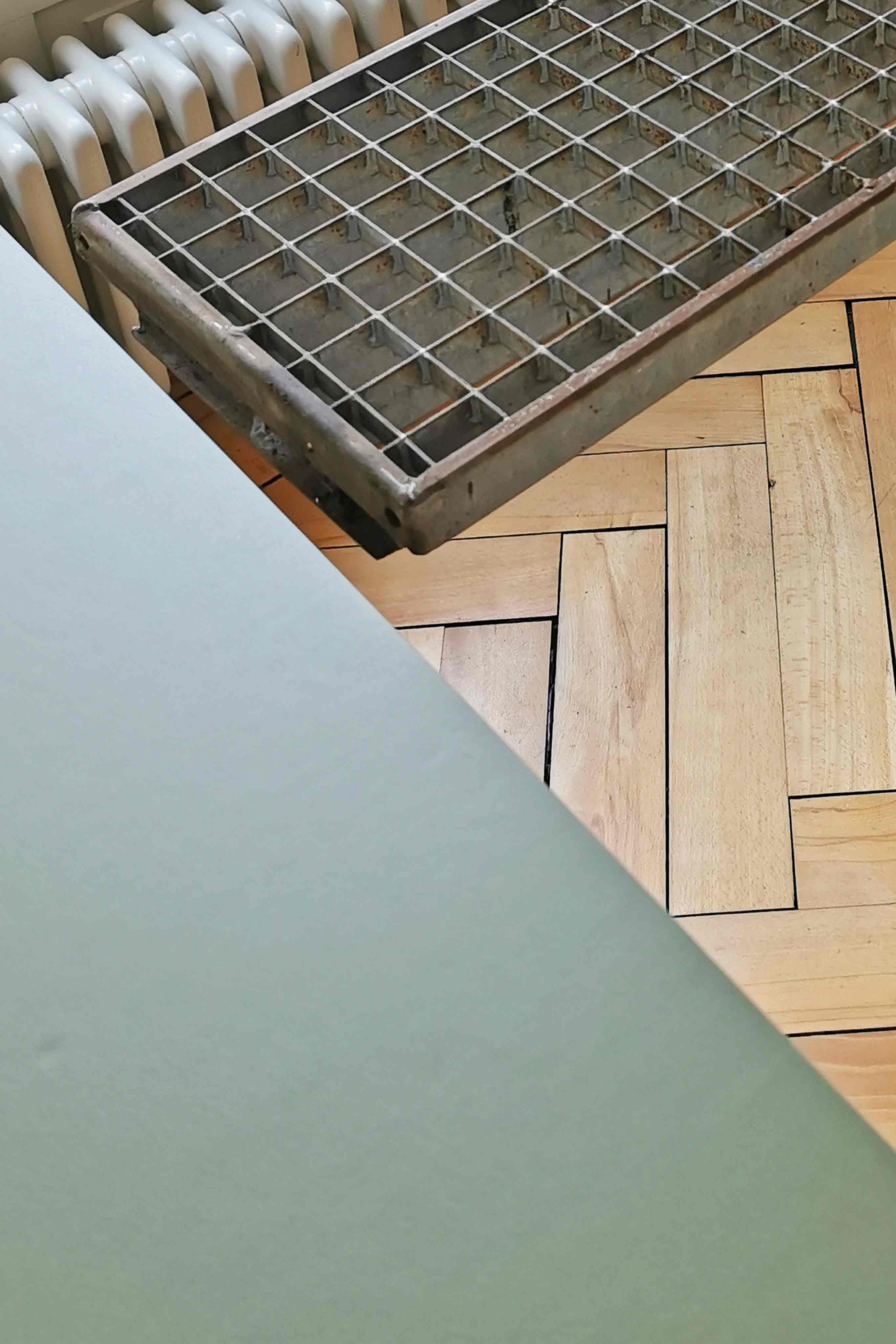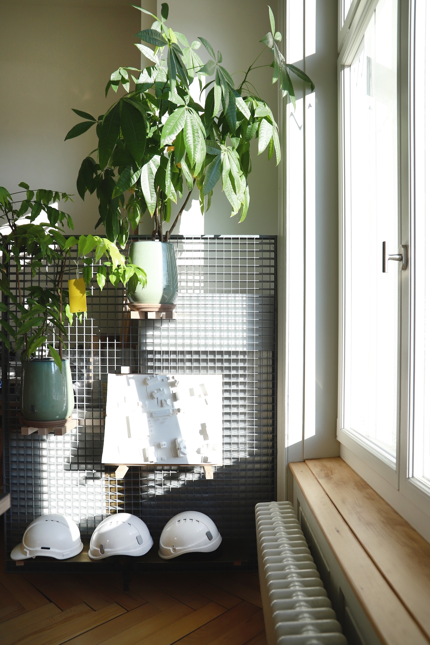 Mit dem Umbau am Wachthügel und der Garagenaufstockung in Steinach wurden bereits Erfahrungen mit der Wiederverwendung von Bauteilen gesammelt. Einen Nottreppe, welche beim Projekt der Montagehalle der Zünd Systemtechnik AG für die Zwecke der Wiederverwendung beiseite gelegt wurde, konnte demontiert werden und für die Ablageflächen und Tischgestelle in den neuen Büroräumlichkeiten wieder eingesetzt werden. Durch die Ergänzung mit vertikalen Elementen aus Buchenholz entstand ein flexibles System, welches verschiedene Kombinationen der Gitterroste ermöglicht. Der Altbau an der Burgstrasse 12 wird dadurch mit industriellen Elementen ergänzt. Durch die Kombination von Alt und „Neu“ zeichnet sich die Philosophie des Büros in der Einrichtung ab.